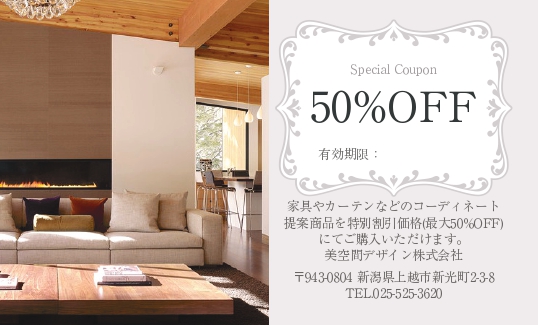 ご提案したインテリア品(特別割引価格、最大50%OFF)をお買い求めいただいた場合は、カーテンの取り付け、家具のセッティング等まで責任をもって行います。