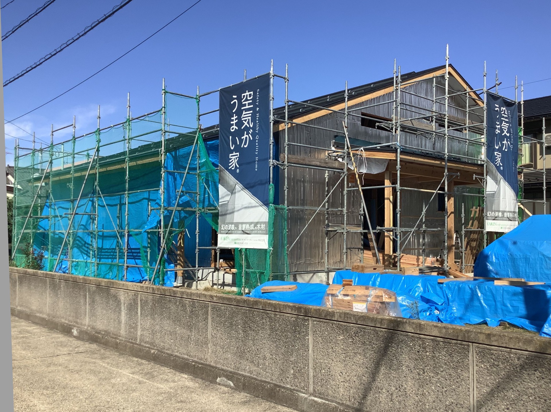 外壁の張り工事が終わりました。これから、外壁材の目地、サッシ廻り等のコーキング工事を行い、漆喰塗りで仕上げます。