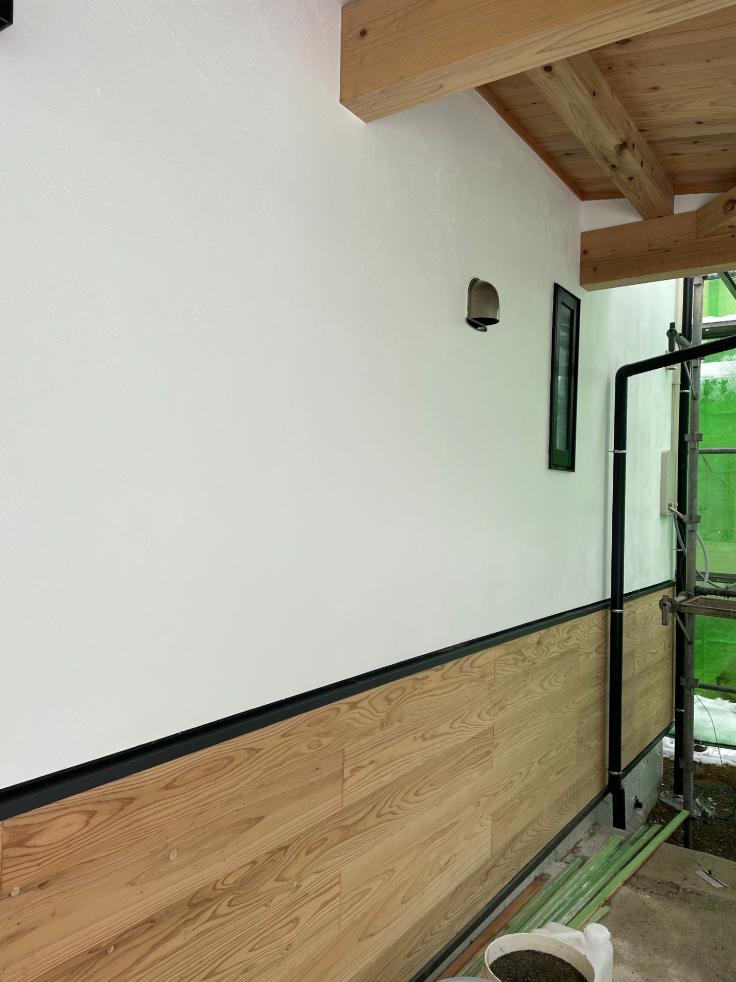 外壁の左官工事が完了しました。左官材は、幻の漆喰「そとかべ」を使用しています。