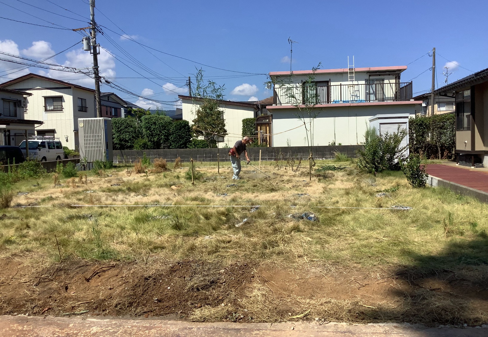 地盤改良工事後に、建物の外周部にあたる部分にひもを張り、敷地に対しての建物の配置を確認する立会いを行いました。