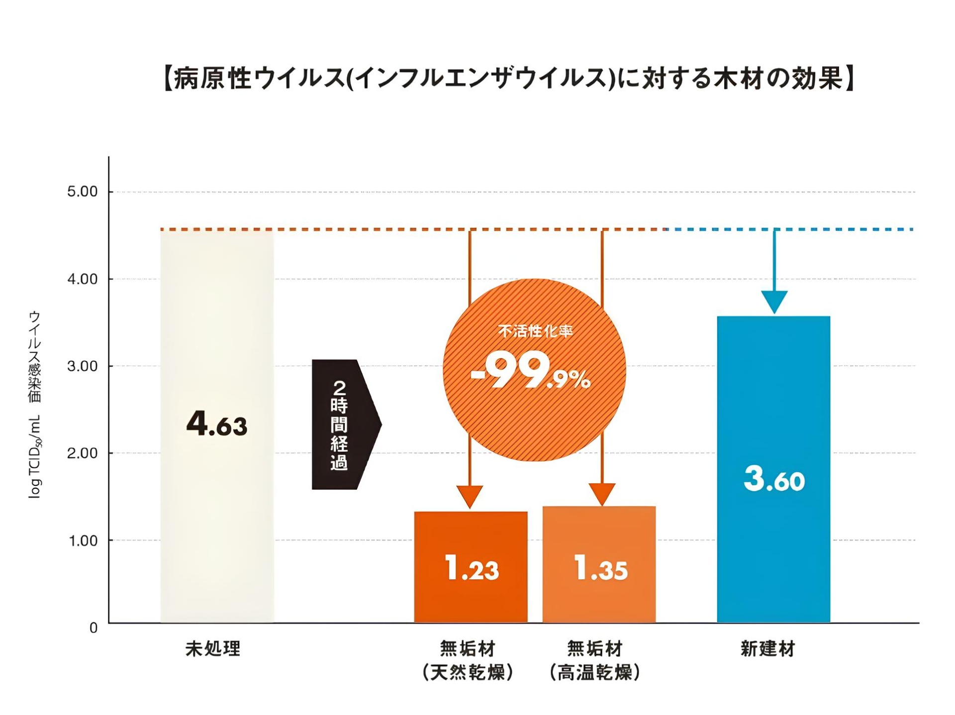 その結果、スギ無垢材(天然乾燥および高温乾燥)は、インフルエンザウイルスA型(H3N2)を99.9%以上不活化することが確認されました。(下の図を参照ください。)